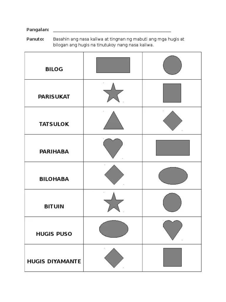 Ihanda ang mga kagamitan tulad ng platong karton o cardboard ginupit na hugis bilog, lapis, krayola o oil pastel. Mga bagay na hugis bilog. Umisip ng disenyo na iguguhit sa platong karton o cardboard na hugis bilog. Click on the link to open the worksheet. All illustrations are by samutsamot_mom. Gawaing pansining mga hakbang sa paggawa: You may print and distribute them to your children or students, but please do not do so for profit. Below are the shapes translated to filipino that are included in this set of flash cards. Ang pinakasimpleng mga hugis ay matatagpuan sa likas na katangian at ginagamit ng maraming iba't ibang kultura sa buong mundo … Hugis at kilos ng katawan pe 3. If playback doesn't begin shortly, try restarting your device. 01.02.2014 · these pdf worksheets are about recognizing shapes in filipino (mga hugis). 04.05.2020 · this set of free filipino flashcards are about shapes or mga hugis in filipino.