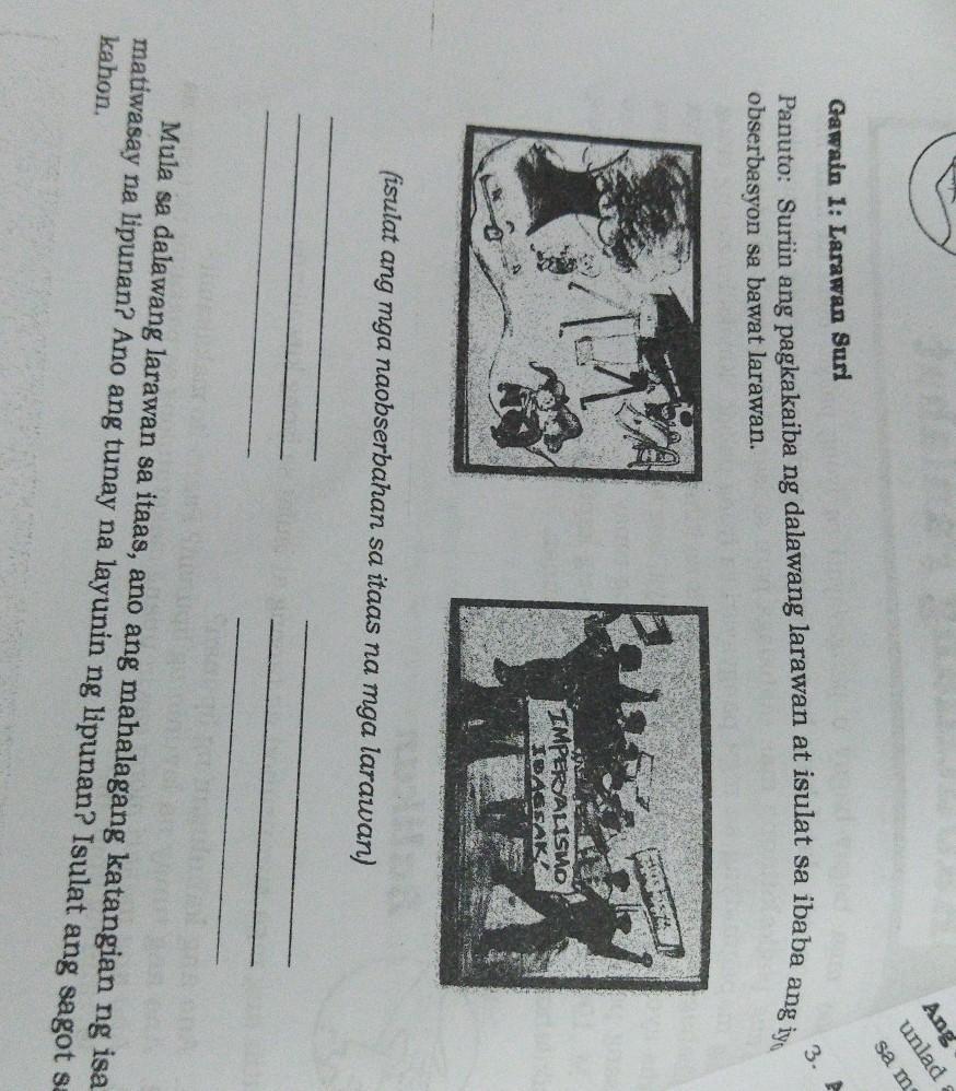 Tuklasin Gawain 1 Larawan Suri : Araling Panlipunan 2nd Grading Hs Portfolio Review / Maikling muling pagtalakay sa kahalagahan ng komunikasyon.. Aralin 1 ang daigdig tuklasin gawain 1: Tuklasin sa bahaging ito, ang bagong aralin ay ipakikilala sa iyo sa maraming paraan tulad ng isang kuwento, awitin, tula, pambukas na suliranin, gawain, … Pansinin at suriin ang bawat isa. Esta tabla de clasificación ha sido deshabilitada por el propietario del recurso. Qi week 2 gawain 4 larawan suri social studies quizizz from quizizz.com pagkatapos nitoy maging handa sa pagsagot sa pangprosesong mga tanong.